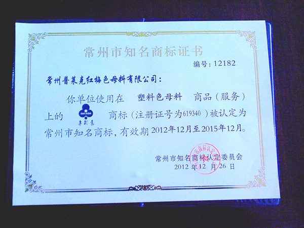 2012年12月份,我司速彩達商標被認定為常州市知名商標,下圖為獲獎證書。