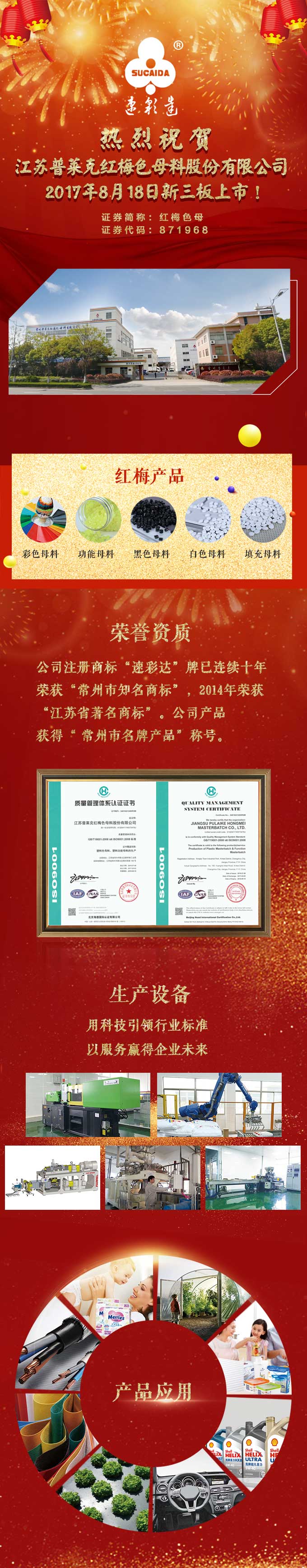 江蘇普萊克紅梅色母料股份有限公司于2017年8月18日在全國中小企業(yè)股份轉(zhuǎn)讓系統(tǒng)(新三板)正式掛牌交易。