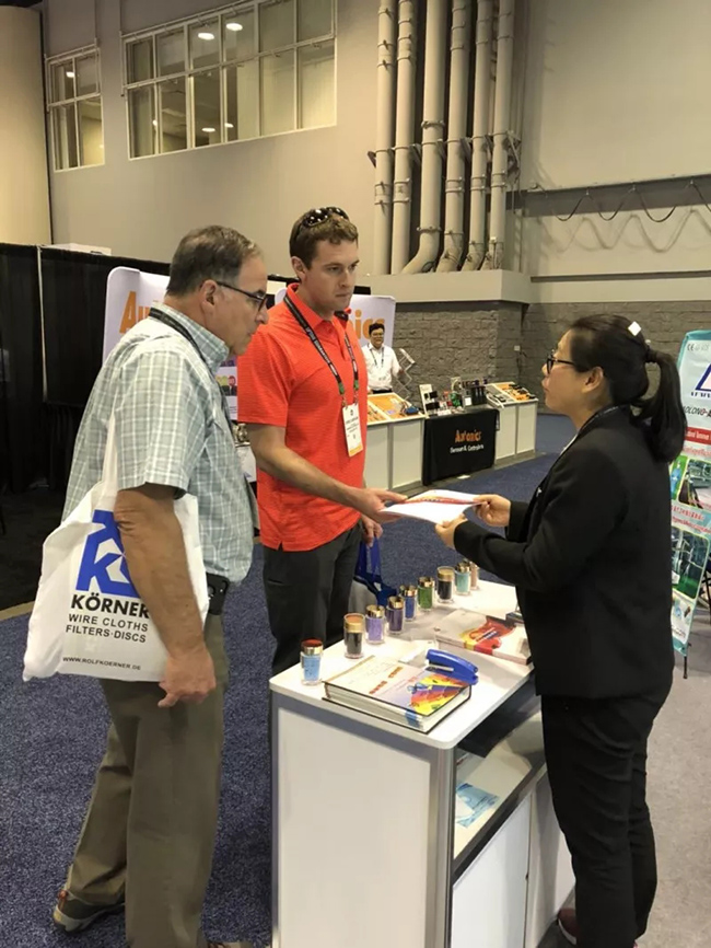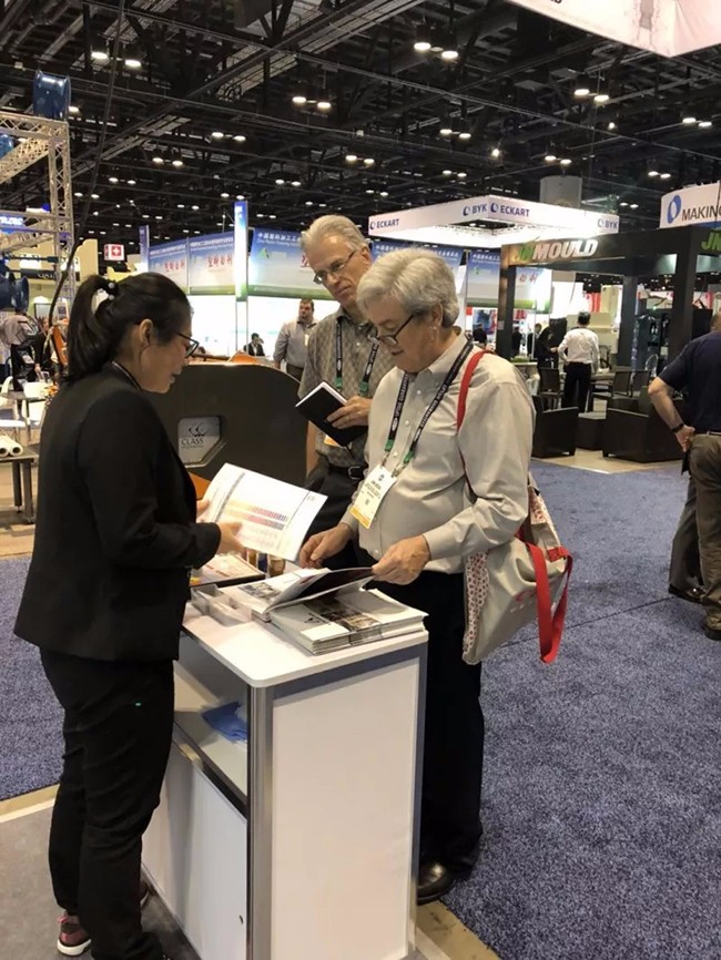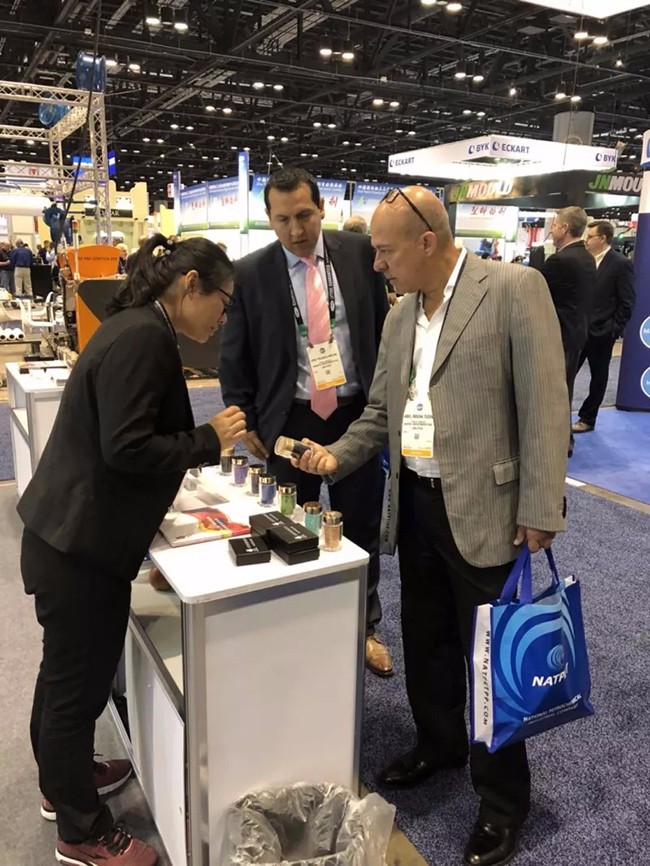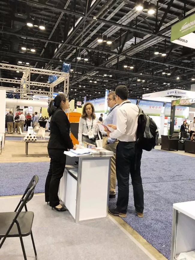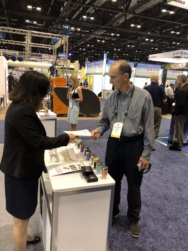 ▲ 紅梅展位上,新、老客戶紛至沓來,紅梅為此次NPE美國塑料展做了精心的準備,不僅有相關產品的宣傳冊書面資料,同時還有色母粒產品現場展示,讓客戶們能夠全方面的了解紅梅的母料產品。
